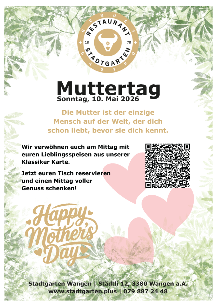Schenken Sie Ihrer Mama Zeit, Wertschätzung und ein feines Essen im Herzen von Wangen an der Aare.