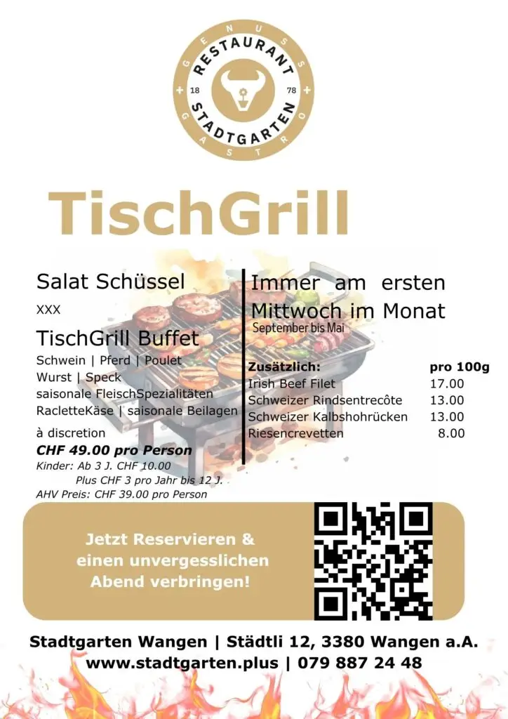 Jeweils von September bis Mai erwartet Sie im Restaurant Stadtgarten ein kulinarisches Erlebnis der besonderen Art: das TischGrill Buffet à Discretion. Perfekt für Fleischliebhaber, Gruppen und gemütliche Abende in bester Gesellschaft.